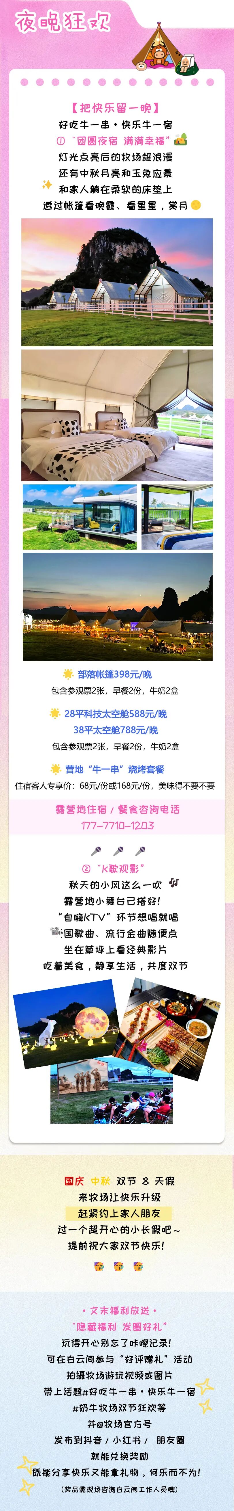 2025年10月1日-10月8日双节期间牧场精心筹备了一系列精彩活动涵盖亲子互动、趣味游玩美味餐饮与夜游狂欢更有多重超值福利等你来拿快来和家人共度欢乐时光吧!