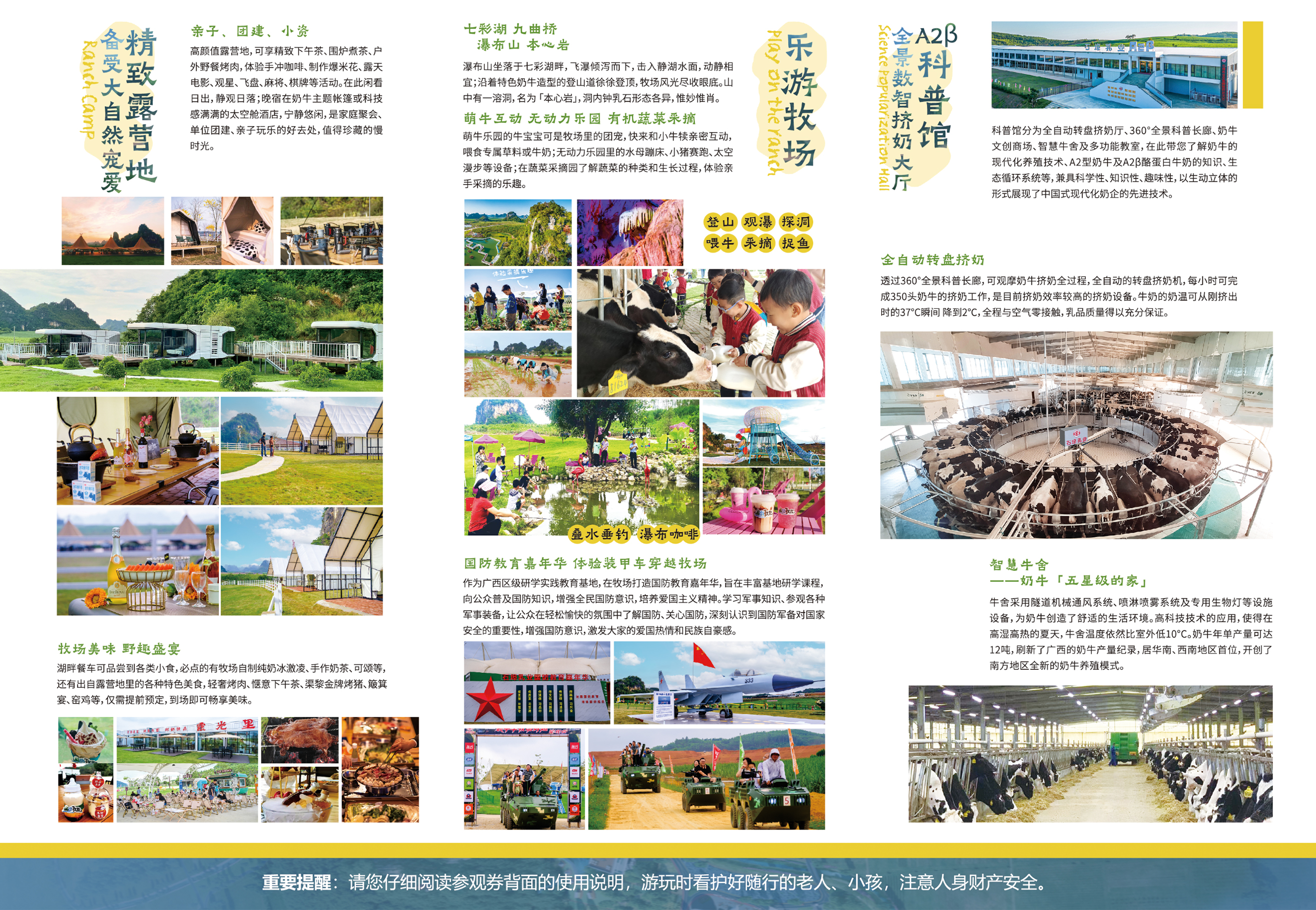 牧场为奶牛养殖重地,不可携带任何宠物入园;严禁携带无人机随意飞行;严禁滑板车、平衡车入内;涉水区域严禁下水;严禁黄赌毒;自然环境中偶有虫蛇出没,请多留意脚下路面情况,注意安全;雨天路面湿滑,请勿登山游洞;请时刻注意人身财产安全;游玩期间请看护好随行的儿童及老人。
